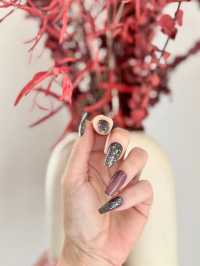 Ashen is a unique medium gray with scattered flecks of gold, pink, and iridescent flakes.