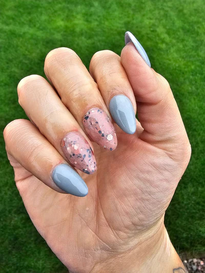 Midnight Blush is a warm, muted rose-pink base with a soft shimmer, accented by small, irregular black and dark charcoal speckles.