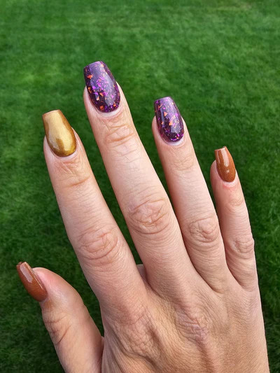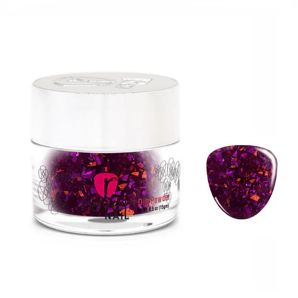 Fiery Plum is a vibrant, jewel-toned magenta-purple base infused with bold, iridescent flakes that shift between vivid fuchsia, electric violet, and fiery copper-orange.
