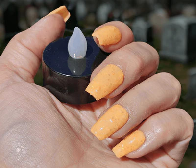 A playful, pumpkin-orange packed with iridescent treats for a festive look in normal lighting. When the lights go out, it transforms— hexagonal glitters glow an eerie green against a dark base, revealing a dramatic, spooky effect.
