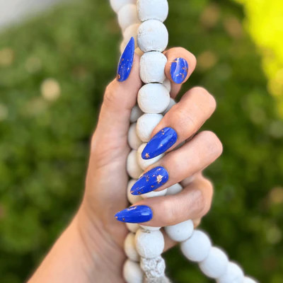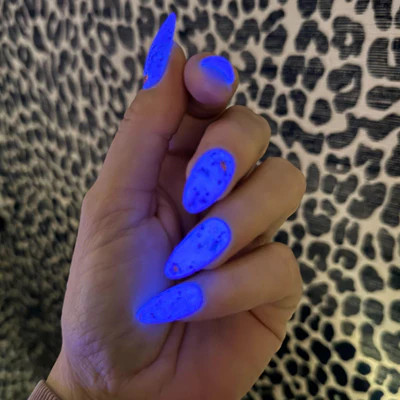 Moonbeam is a celestial blue dip powder with delicate gold flakes. This color reveals itself in the dark - it glows a luminous, ethereal blue!
