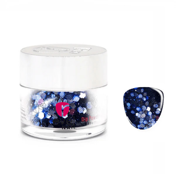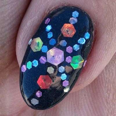 Frosty Fireworks is a dark blue with larger multi-colored glitters that resemble fireworks suspended in a frosty blue sky.