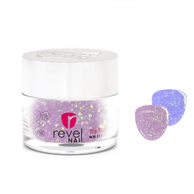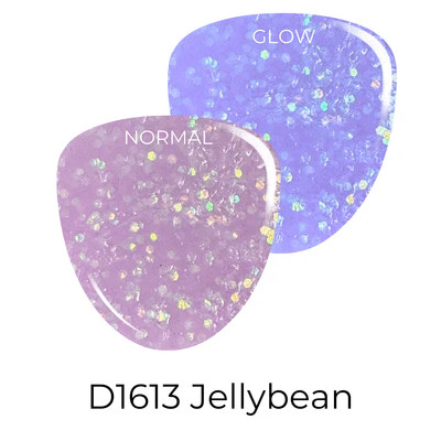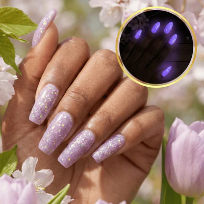 This color is a soft lavender haze with iridescent glitters that catch the eye with colors of purple, blue, pink and green. This color glows a purplish blue in the dark after being exposed to the sun!